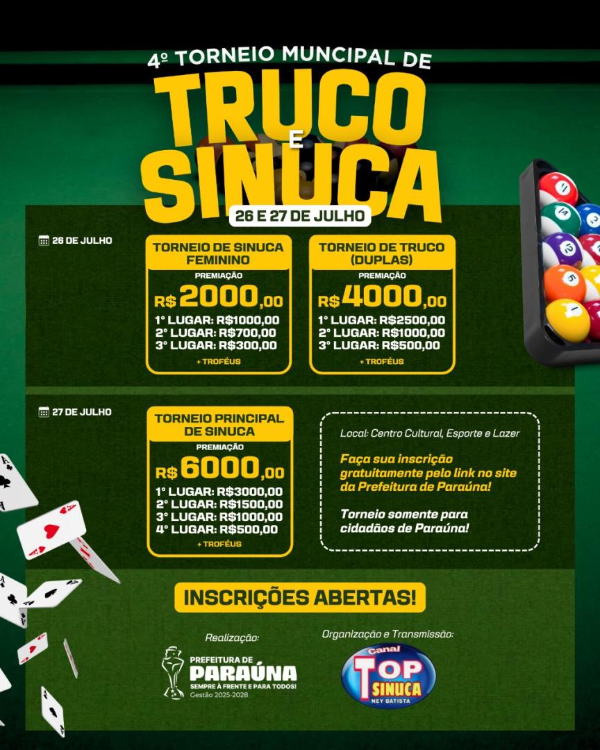 É na mesa que se revelam os verdadeiros talentos. O 4º Campeonato Municipal de Sinuca já é tradição em Paraúna, reunindo grandes nomes, belas jogadas e muita emoção. E nesta edição, a disputa fica ainda mais eletrizante com a chegada do 1º Torneio de Truco em Duplas!