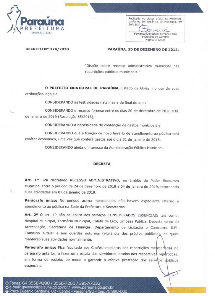 Decreto 374/2018- Dispõe sobre recesso administrativo municipal. Tweet Recesso administrativo municipal 2018/2019. Anexos decreto recesso 2019_0009.pdf