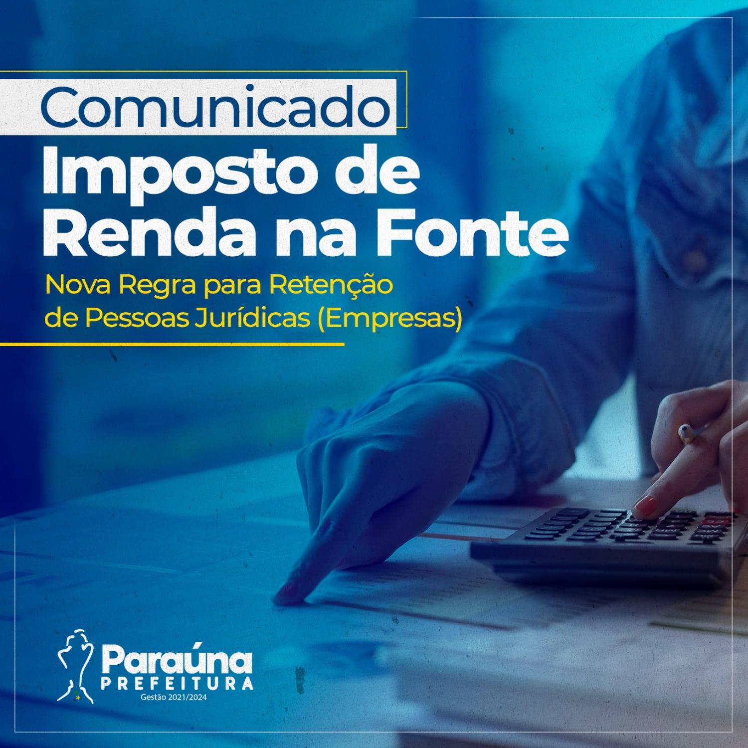 A Prefeitura Municipal de Paraúna, por meio da Secretaria de Finanças e Planejamento, COMUNICA que o Município de Paraúna e seus órgãos e entidades da Administração Pública Direta, incluindo autarquias, fundos e fundações, passarão a efetuar, a partir do dia 1º de Dezembro de 2023, a retenção na fonte do Imposto sobre a Renda (IR), incidente sobre os pagamentos que efetuam às pessoas jurídicas, pelo fornecimento de bens ou prestação de serviços em geral, inclusive obras de construção civil.