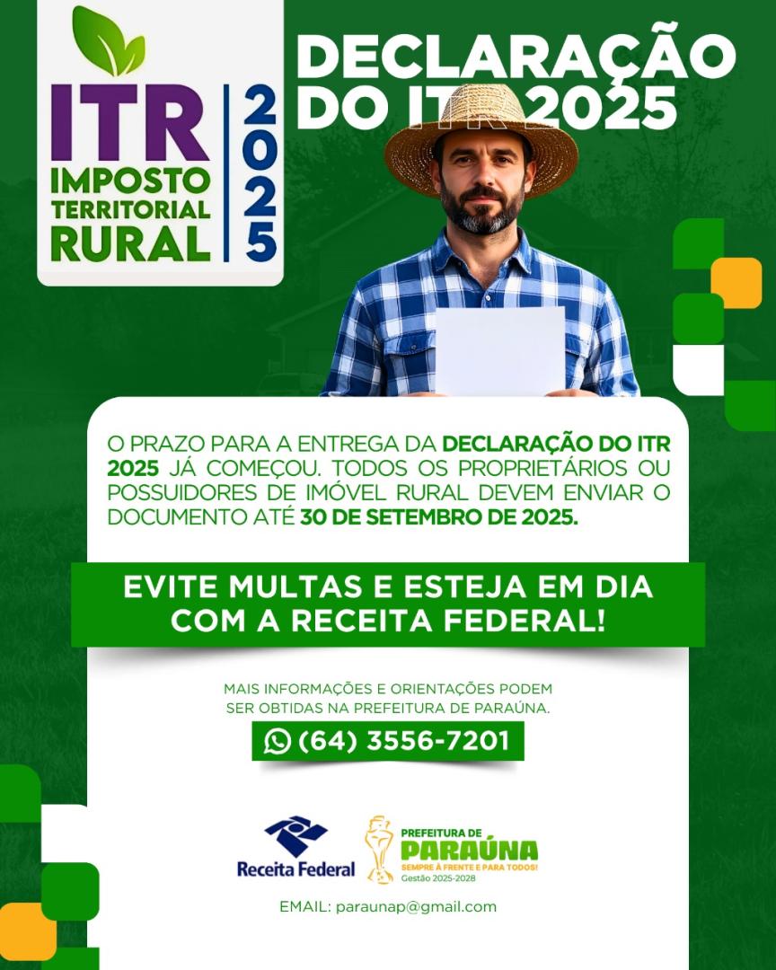 Prefeitura Municipal de Paraúna #Paraúna #PrefeituraDeParaúna #NossaCidadeNossaGente #ITR #DITR #ImpostoRural #ReceitaFederal